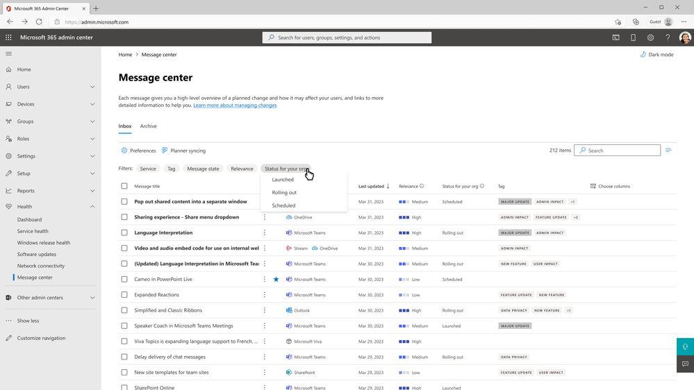 An image demonstrating filter capability on the feature rollout status in Message center to track release status at a glance.