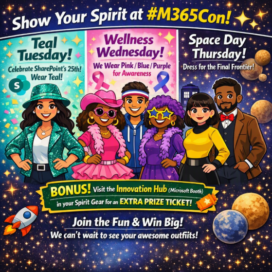 Visit M365Conf.com and follow the action on: X/Twitter: @M365Conf / #M365Con, @Microsoft365, @MSFTCopilot, @SharePoint, @OneDrive, @MicrosoftTeams, @MSPowerPlat, @Microsoft365Dev, and @MSFTAdoption. And on our Microsoft Community LinkedIn and Learning YouTube channel.