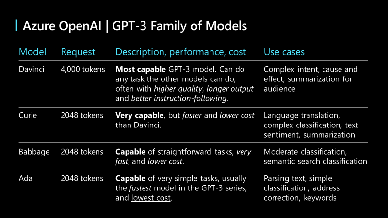 Per quanto riguarda la famiglia di modell GPT-3, abbiamo 4 modelli diversi: