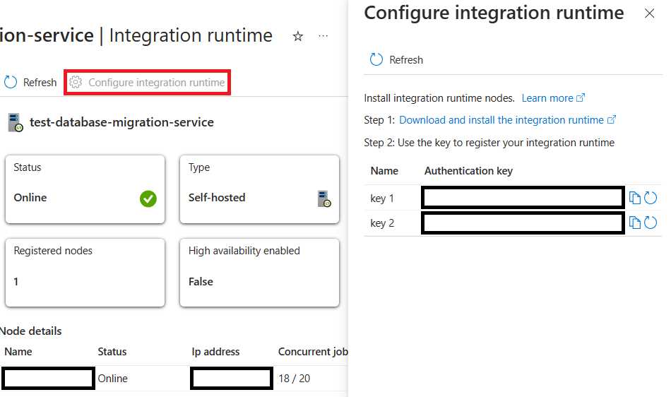 You will likely benefit from registering more than one SHIR node. You can do this by installing the integration runtime software on a separate machine from your existing SHIR. When running the SHIR software for the first time, register the machine with an IR key from your DMS instance. You can find your IR keys by navigating to your DMS instance and clicking "Integration runtime" on the lefthand side, then clicking "Configure integration runtime".
