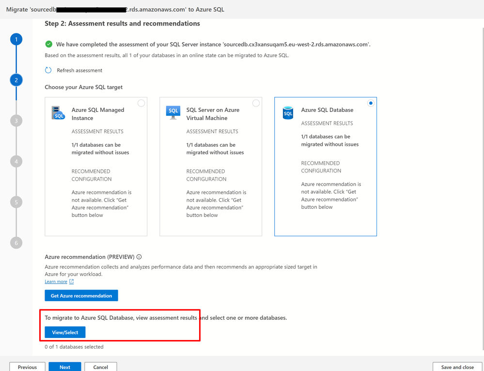 - In Step 1: Databases for assessment in the Migrate to Azure SQL wizard, select the databases you want to assess. Then, select Next.