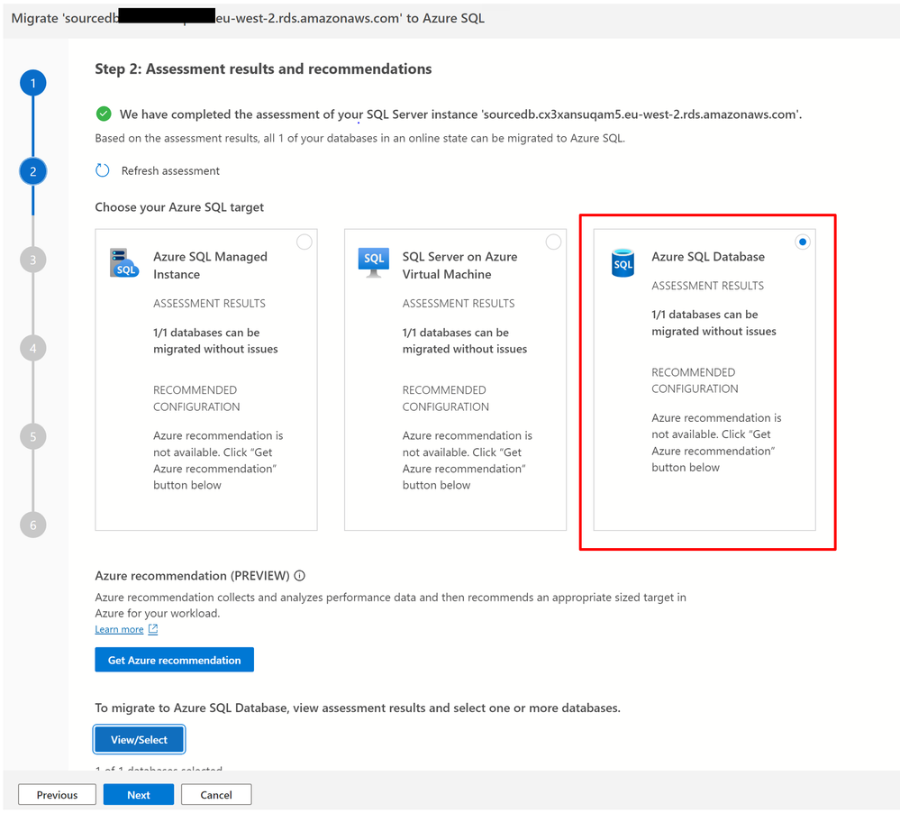 - It is important to mention that you do not need an Azure account to complete the database assessment or Azure recommendation steps in the migration wizard. An Azure account is only needed when configuring the migration steps.
