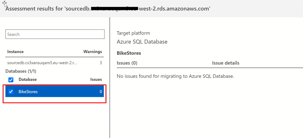 c. In the assessment results, select the database, and then review the assessment report to make sure no issues were found.