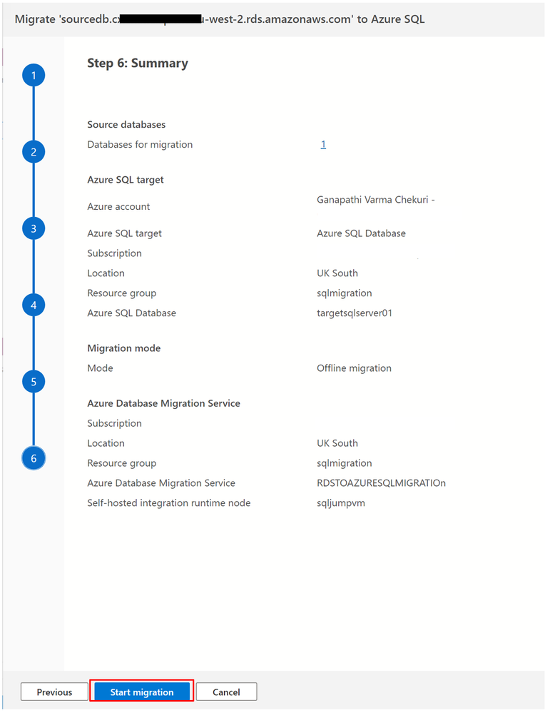 In Step 6: Summary in the Migrate to Azure SQL wizard, review the configuration you created, and then select Start migration to start the database migration.