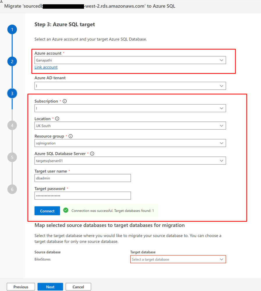 a. Select your Azure account, Azure subscription, the Azure region or location, and the resource group that contains the Azure SQL Database deployment.