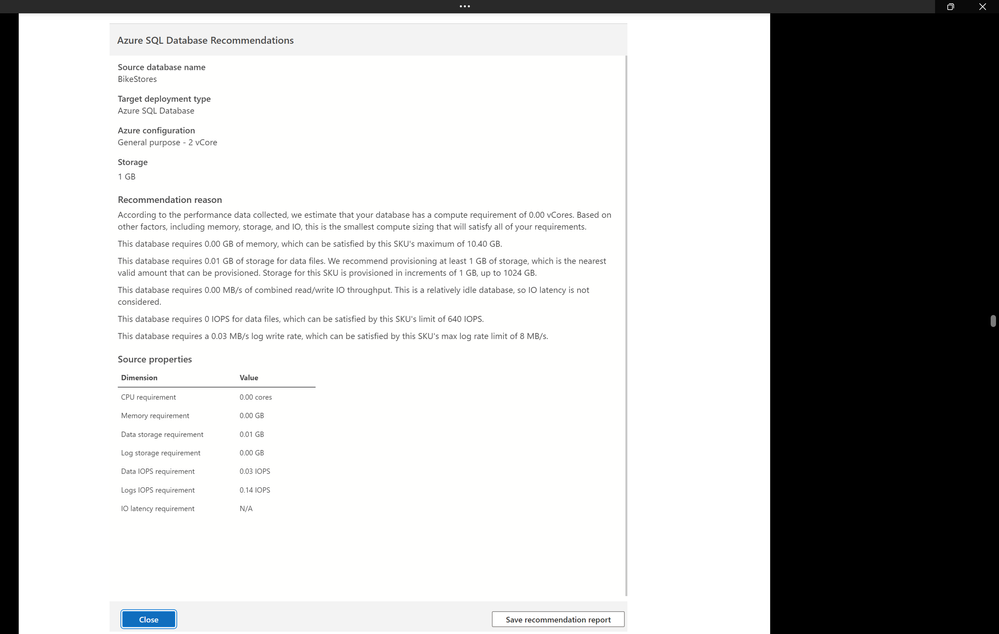 g. In the selected Azure SQL Database target, select View details to open the detailed SKU recommendation report: