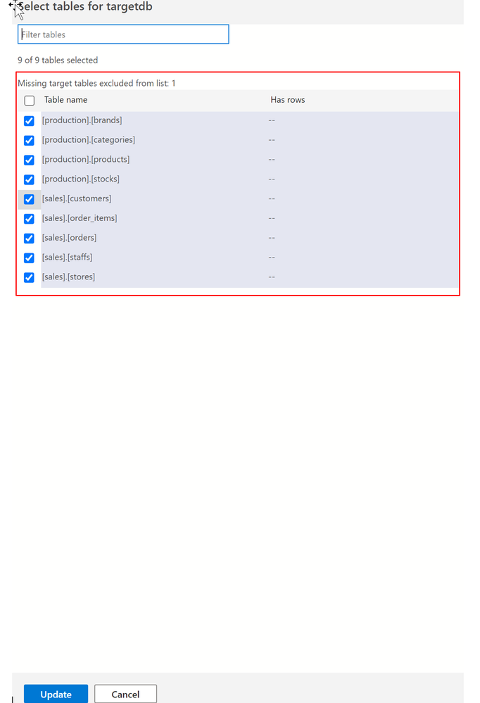 3. In Select tables for <BikeStores>, select the tables to migrate to the target. The Has rows column indicates whether the target table has rows in the target database. You can select one or more tables. Then, select Update.