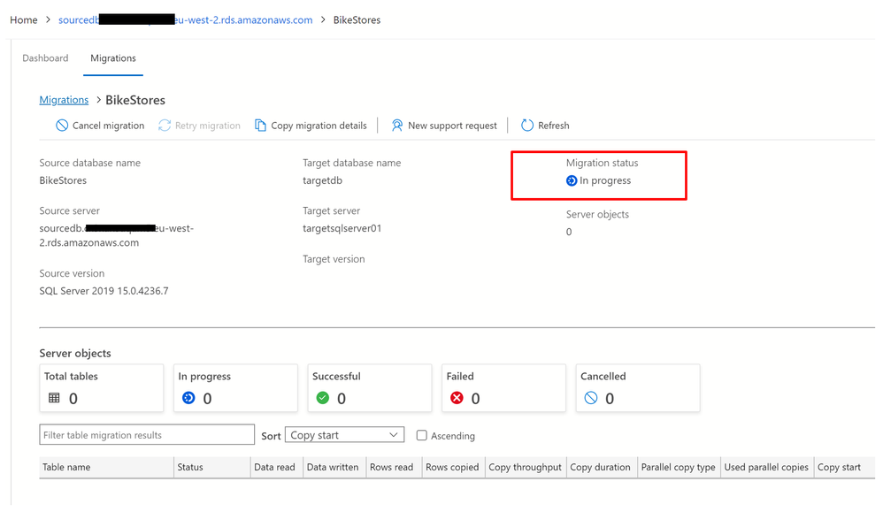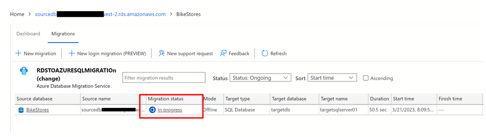 Under Database migration status, you can track migrations that are in progress, completed, and failed (if any), or you can view all database migrations.