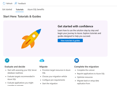 By selecting the Azure SQL Benefits tab, you’ll gain insights into the advantages of Azure SQL - helping you make well-informed decisions about your migration. By selecting the Tutorials tab, you will access information helping you getting started with the solution.