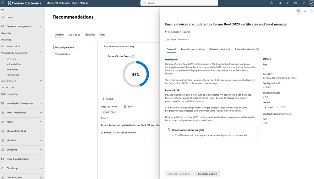 A new recommendation in Defender allows you to ensure that devices are updated to Secure Boot 2023 certificates and boot manager, providing a centralized, at-scale view of Secure Boot certificate readiness across your environment.