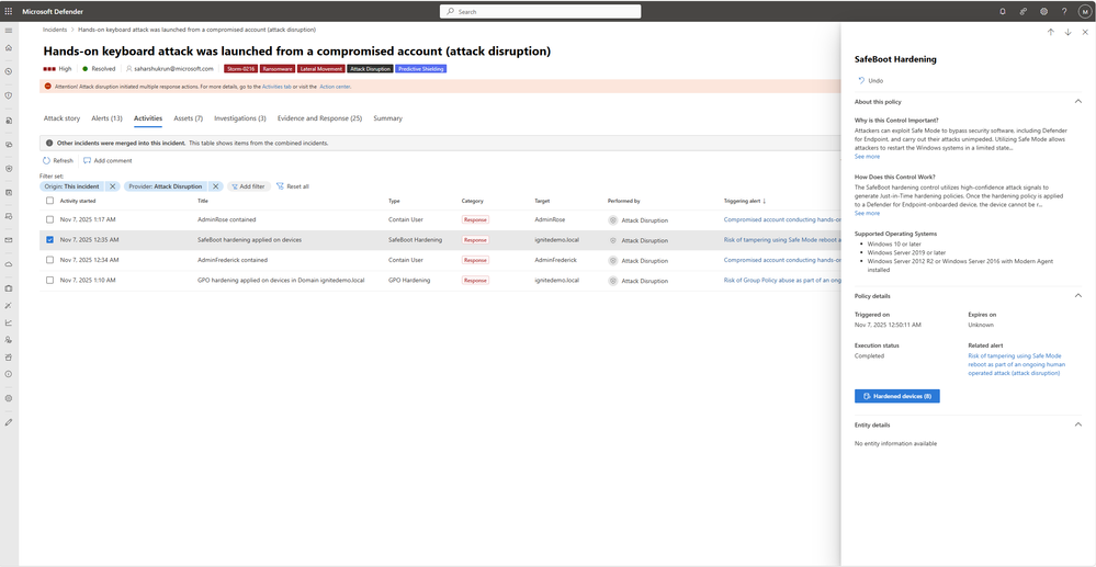 While the precision of predictive shielding allows us to block operations surgically, security teams remain in command, with full visibility and control. All collected data and predictive shielding actions are available for investigation in the Defender portal, with controls that allow security teams to turn off hardening tactics with one click.