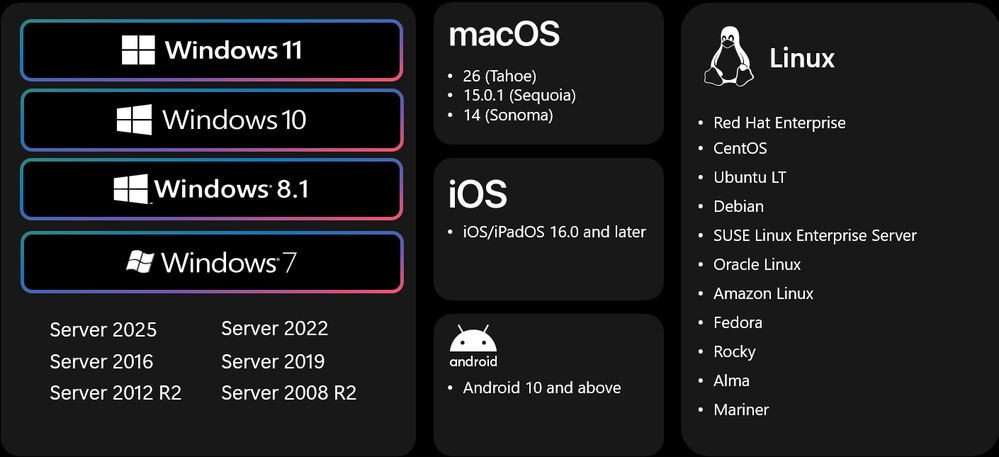 Image 5: Operating system coverage with Microsoft DefenderThis new release further expands Defender support to the broad set of Windows, macOS, iOs, Android, and Linux versions listed in image 5. We’re committed to meeting you where you are to help you protect the most vulnerable points in your environment, so we are always evaluating demand and will continue to expand our coverage moving forward.