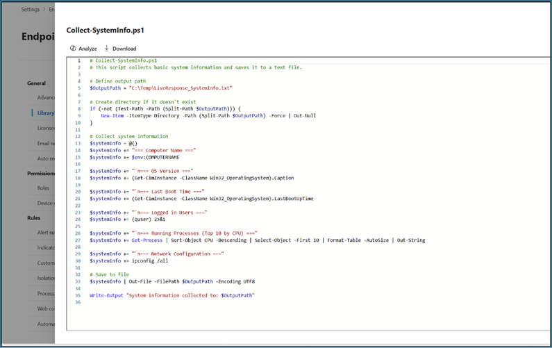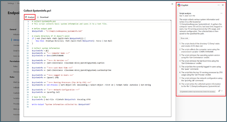 View script contents in the portal – No need to switch tools, analysts can review script contents directly within the Defender UI to validate logic and confirm functionality before execution.