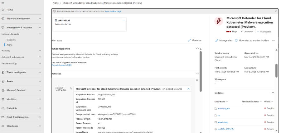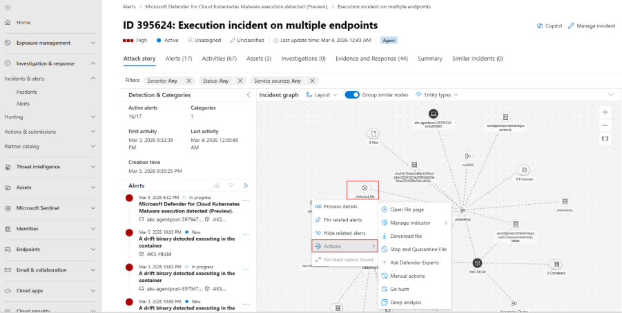 Security Operations teams can further investigate the infected file by navigating to the Incidents and Alerts section in the Defender portal.