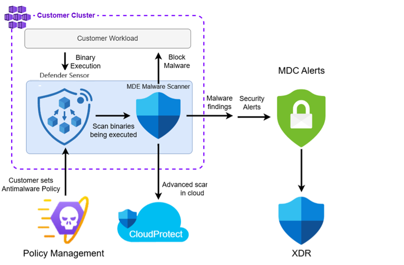 Defender for Containers Sensor integrates with Microsoft Defender Antivirus cloud protection, which provides Global threat intelligence, Machine learning classification, Reputation scoring, Zero-day detection. When suspicious binaries appear, cloud analysis determines whether they should be allowed or blocked.