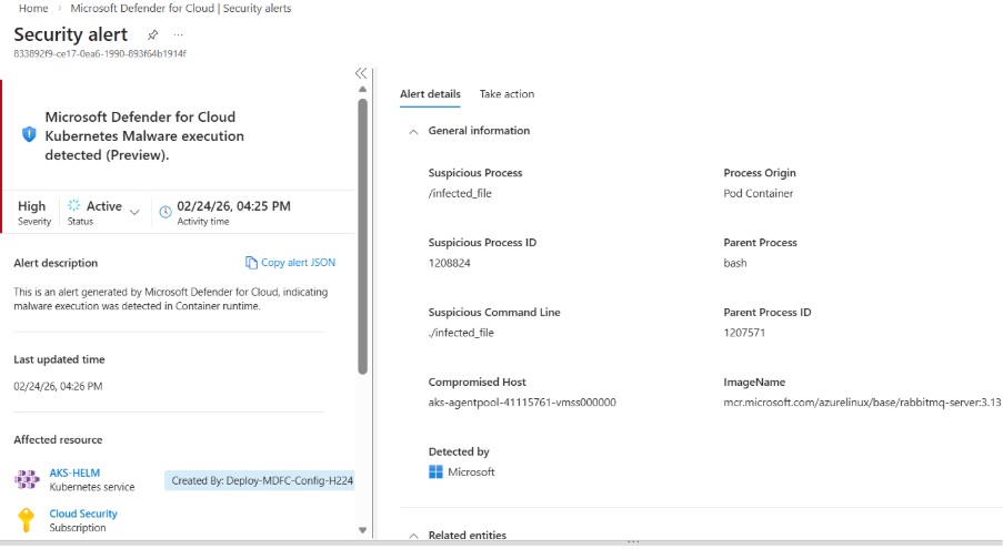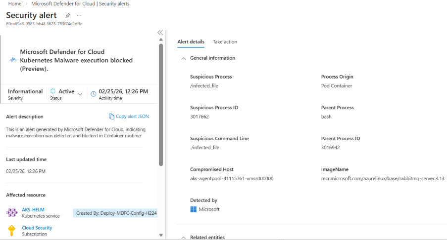 If policy action = Block Malware, the sensor performs enforcement. Blocking actions include, Killing malicious process and Generates Defender for Cloud alert as below: