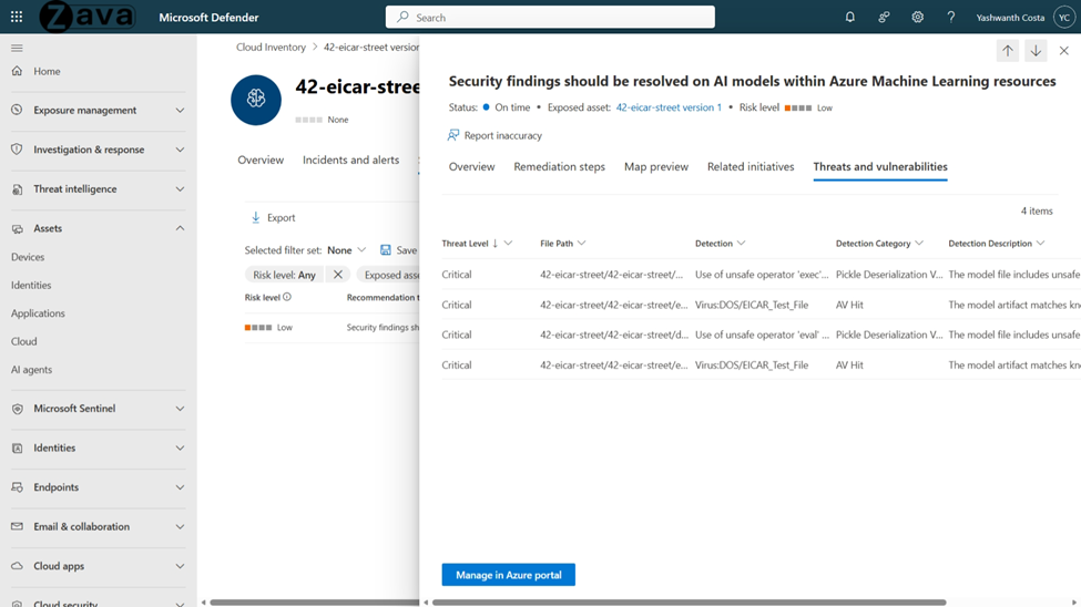 AI model scanning in Microsoft Defender now provides scanning for models stored in Azure ML registries and workspaces covering malware, unsafe operators, and backdoors across common model formats.