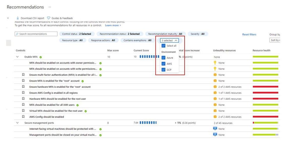 When you enable Microsoft Defender for Cloud you will be able to connect to AWS and GCP using native Microsoft Defender for Cloud connectors. Once you connect to each cloud provider, you will be able to use the Security Recommendations to quickly filter the environment and see only the recommendations that are relevant for the cloud provider that you want, as shown below: