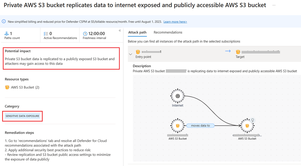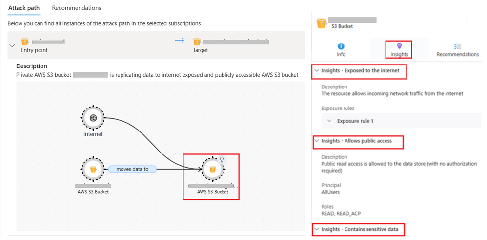 Using Defender CSPM attack path analysis, the data engineering team can identify this scenario and remediate the risk. The attack path “Private AWS S3 bucket replicates data to internet exposed and publicly accessible AWS S3 bucket” shows the misconfiguration and the potential impact as shown below: