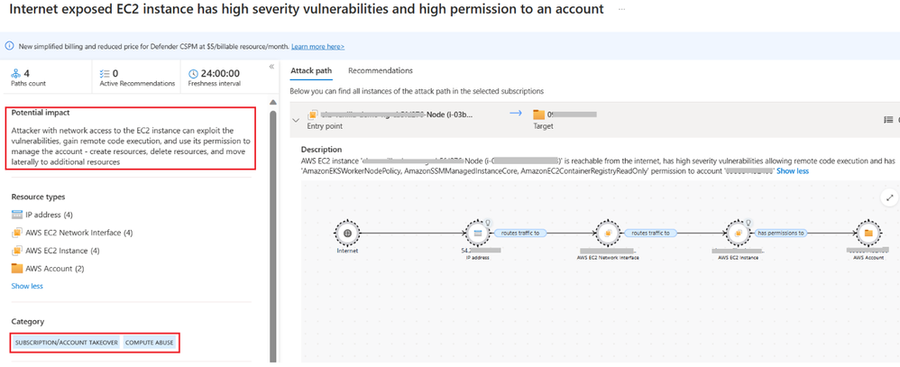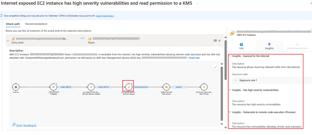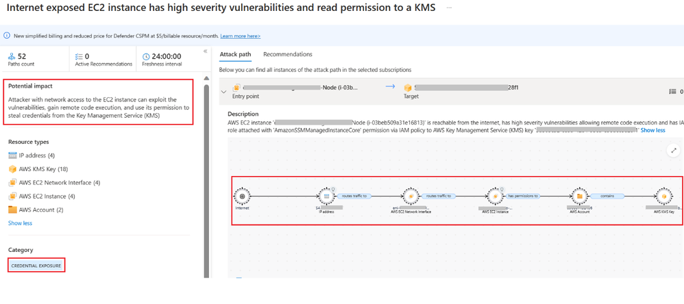 Defender CSPM identifies the attack path “Internet exposed EC2 instance has high severity vulnerabilities and read permission to a KMS” and the potential impact could be stealing credentials from the Key Management Service (KMS).