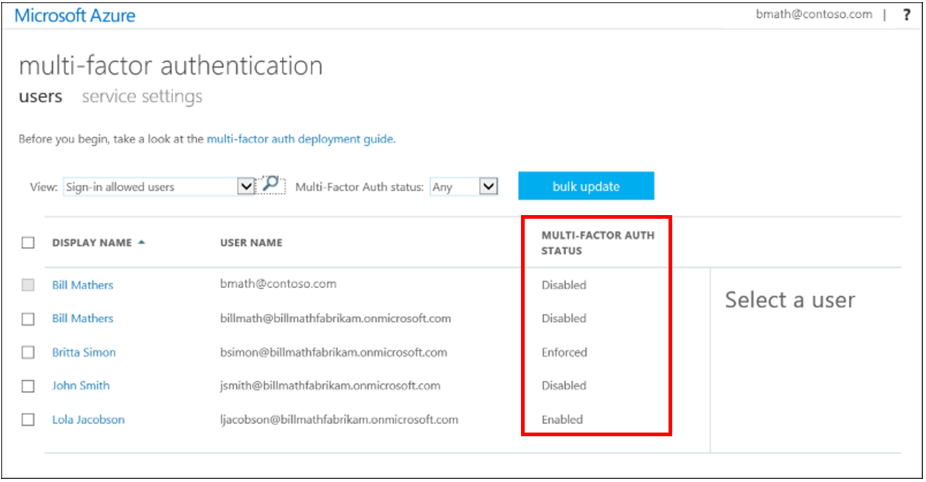 Now that you’re on the MFA page for users, you can select all users who are OWNERS or WRITERS of the subscription, and roll out MFA in one fail swoop (Doing so for ALL users in the environment isn’t really recommended, you want to do that in chunks starting with the privileged accounts) or you can select individual accounts to start enabling MFA against for testing.