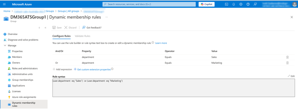 Create a dynamic group in Microsoft Entra ID - Define the rules for the dynamic query based on the user properties that you want to use. You can add multiple rules and combine them with AND/OR operators.