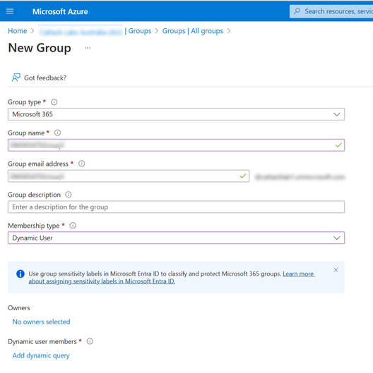 - Create a new group and choose Microsoft 365 as the group type. Enter a name, email address, and description for the group. Select Dynamic user as the membership type and select Add dynamic query.