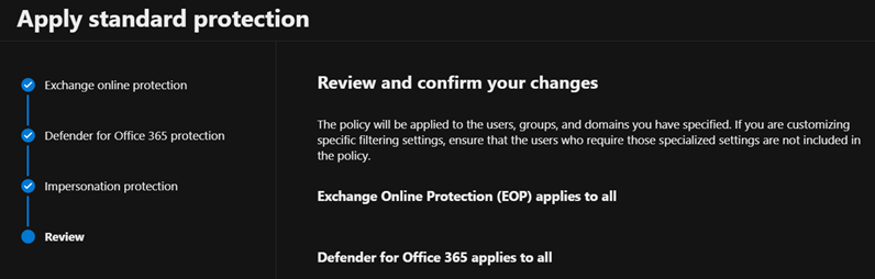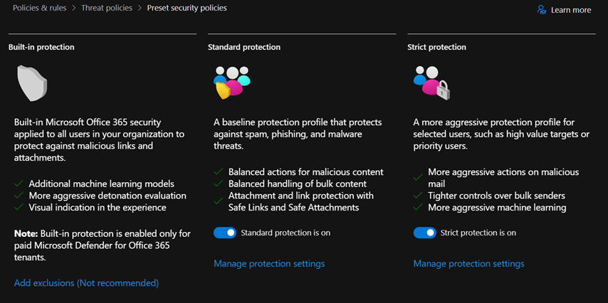One of the best tools Microsoft has provided for onboarding is the Preset Security Policies feature. These come in two flavors: Standard and Strict.