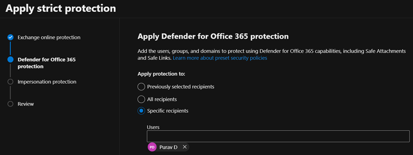 Figure 6 - Apply strict Defender for Office 365 protection for priority users