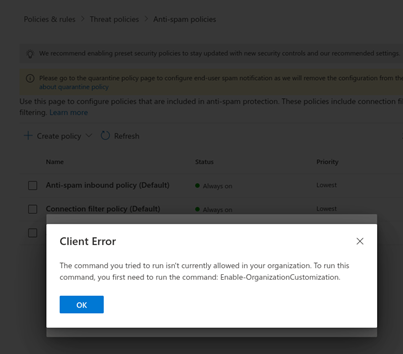 The fix is simple. Run the Enable-OrganizationCustomization PowerShell cmdlet from Exchange Online. It is a one-time configuration task, but it is essential for policy management and overall service functionality.