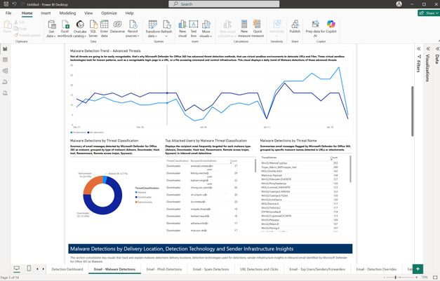 Today we are excited to announce a brand-new Power BI template file designed for Microsoft Defender for email and collaboration security customers. Additionally, we've released an updated version of the Microsoft Defender for email and collaboration Detections and Insights workbook within Microsoft Sentinel. Both offerings feature a unified visual design and structure, ensuring consistent experience no matter which platform you use.