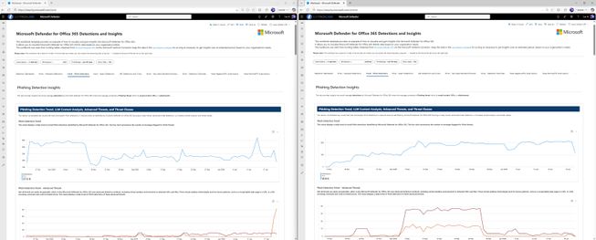 For example, you can compare phishing detection trends or top attacked users across two or more tenants simply by opening the workbook in two browser windows placed side by side.
