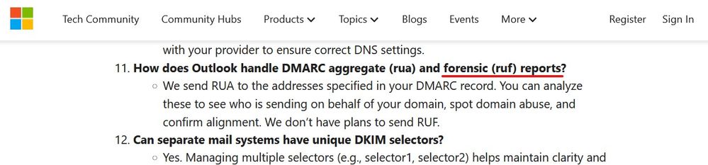 11. How does Outlook handle DMARC aggregate (rua) and forensic (ruf) reports?