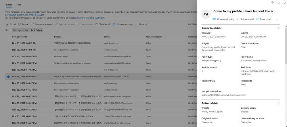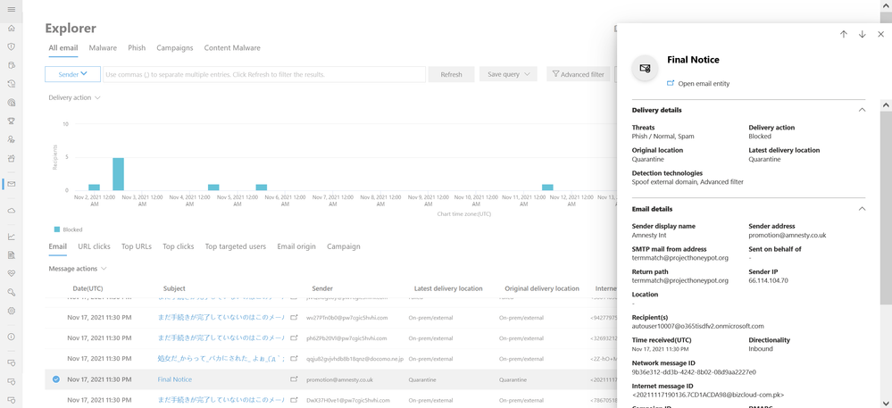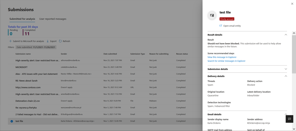 We’re making it easier to view a single, integrated, 360-degree view of an email through the email entity page and provide a more consistent experience across Microsoft Defender for Office 365 and Microsoft 365 Defender. The email entity page contains a summary panel with a condensed view containing standardized details about the email (e.g., detections) as well as context specific information (e.g., Quarantine or Submissions metadata). It replaces the traditional flyout that was integrated into Threat Explorer, Submissions, and Reporting.