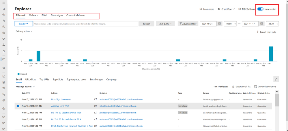 The All-email view becomes the default view for Threat Explorer (Note: Malware view continues to remain the same for real-time detections), with the default time range set to 2 days, which is an update from the current default time range of 7 days (you can still extend the search period to a maximum of 30 days). You can also tab across different views to get to the desired Phish or Malware view.
