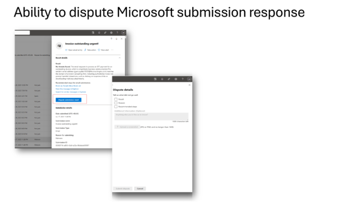 With the new dispute submission response feature, Microsoft Defender for Office 365 bridges a critical gap in the incident response workflow. Now, when a security analyst or administrator receives a verdict on a submitted item, they have the option to dispute the response directly within the Microsoft 365 Defender portal. This feature streamlines feedback, allowing teams to quickly flag disagreements and provide additional context for review at the speed of operations.