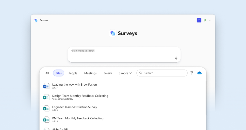 • Grounding to your content: You can now connect Surveys Agent to Word, Excel, and PowerPoint files, as well as existing Microsoft Forms survey links, to help draft and refine surveys with richer context.