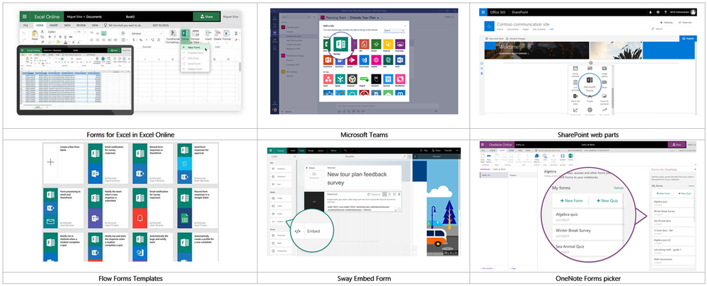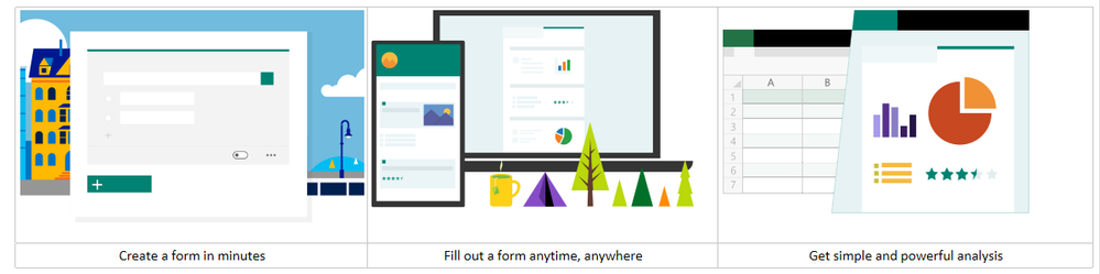 Microsoft Forms is deeply integrated with Office365 apps to provide a seamless experience for basic data collection. Please note some of the integration feature are under rolling out and will be available for your organization soon.