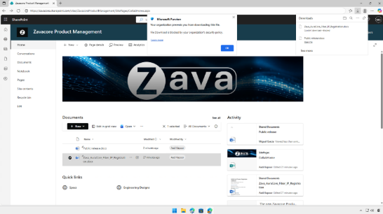 Figure 3 Purview DLP: Displays a pop-up message to indicate organizational protection for a file download.