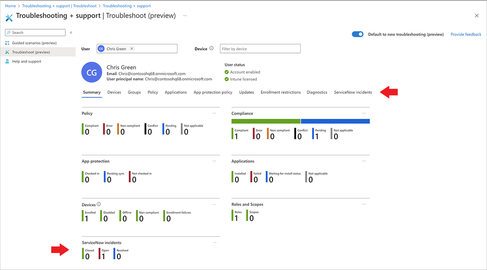 With the ServiceNow connector verified and enabled, you will be able to view a real time list of ServiceNow incidents for a worker. To do this, use the Troubleshooting view. Navigate to the Troubleshooting blade and choose a user. For the example here: Chris Green. You'll notice the troubleshooting preview in the view below. Recently, we updated the Troubleshooting functionality which will soon roll out in public preview such as an overview page showing summary status for each workload with navigational tabs for each workload that drill to the workload's corresponding details.