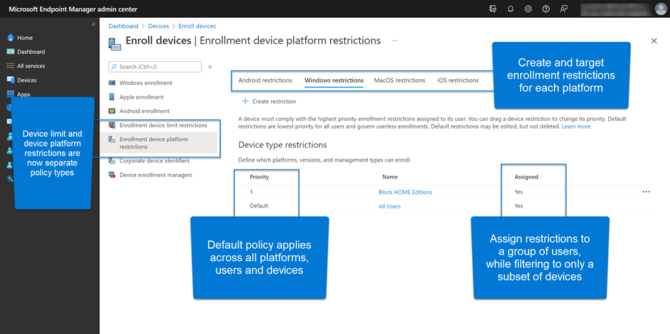 When we spoke to customers, we learned that in order to address these challenges they were developing manual work-arounds which added complexity to endpoint management. By providing filters in enrollment restrictions, we help simplify IT workloads and keep experiences as straightforward as possible, a key principle in our solution design.
