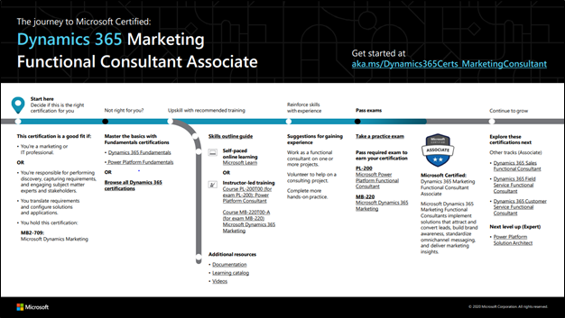 To get started with this certification, check out our Dynamics 365 Marketing Functional Consultant Associate certification journey map. You can also find the journey map in the resources section on the Dynamics 365 Marketing Functional Consultant Associate certification and exam pages.