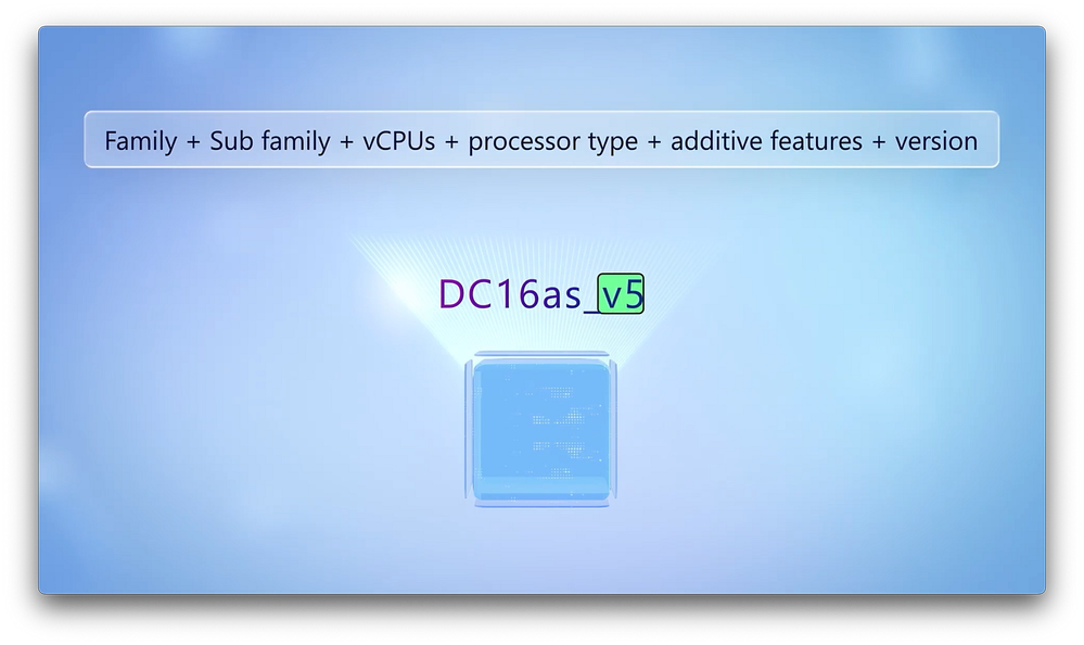 -So let’s break down your core options to select the right VMs for your workloads. Azure VM families are optimized to run any size of workload, from general purpose to memory, compute, and storage intensive workloads, in addition to high-performance computing and AI scenarios. Now, when you’re looking at Azure VM sizes, there’s a structured format that helps you understand the characteristics of each VM. It starts with the family, followed by an optional subfamily, the number of vCPUs, the processor type and additive features, and the version of the VM. Importantly, an a signifies AMD-based processes and p signifies that the VM is powered by Arm-based processes. If you don’t see an a or a p, the underlying processor is Intel based. And then a set of lowercase letters represent additive features, for example, s for premium storage.