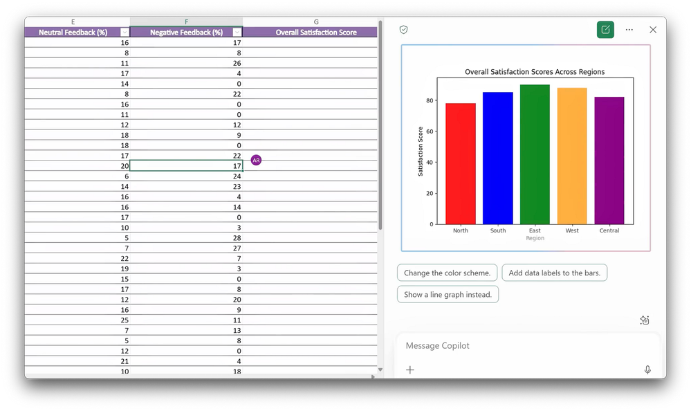-So that was Word, now let’s move on to Excel to create a data visualization that I’ll incorporate also into my presentation. So here I’ve got a spreadsheet that’s full of satisfaction and performance metrics for our new product. On Copilot Chat, I can ask, “Generate a bar chart showing the overall satisfaction scores across regions. Use different colors for each bar.” And I didn’t need to tell Copilot which columns to use or which ones to calculate the insights from in the spreadsheet, it knows what to do. And there’s my bar chart with satisfaction scores across North, South, East, West, and Central regions. It’s exactly what I asked for, without having to leave Excel. So now that I have what I need to update my presentation, I’m going to move over to Copilot Chat in PowerPoint.