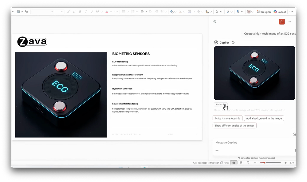 -This is my deck for ZavaCore Smart Fiber, and I want to make a few updates to it based on the email thread from before and what we just did in Word and Excel. And I want to go back to those Copilot chats, so this time in the Copilot pane, I’ll open up the ellipse menu. And from here, I can view all my recent Copilot chats. Well, I’m going to choose the one from a moment ago, “Please remember that I prefer generated content in Copilot Chat to be concise.” And down within that chat session, you can see I have my bullet list of executive summary. And now I’m going to copy that and put that in the New Features Overview. And I’ll keep going, I’ll return back to the previous chat, this time the one from Excel with a bar chart that was based on our open Excel file because I want to add that to my PowerPoint as well. Well, I’ll grab that chart and I’ll place it on the left side of the slide, and now it’s looking how I want it to. I’m going to move on to slide 5 because I want to generate a new image for the slide, so I’ll go back into Copilot and I’ll select New Chat. Now I’ll ask Copilot to, “Create a high-tech image of an ECG sensor.” And that takes a moment or so to generate, but there’s my new image. Once it’s finished, I can add that to my slide.