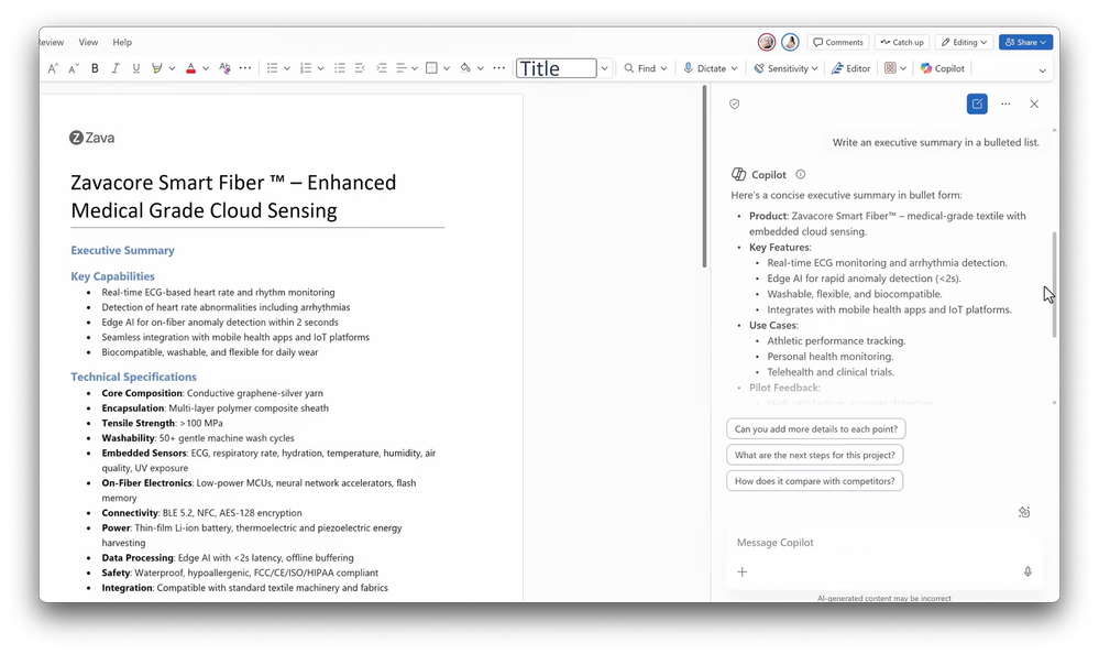 -So here, I’ve got a technical specifications document open for ZavaCore Fiber, I need to add to it for our meeting. Instead of switching apps or uploading files, I just open up Copilot Chat on the right side pane and it understands the context of my open document. I can let Copilot know that I prefer generated content to be concise, and Copilot will take this into account as it generates content. Now I can ask Copilot, “Write an executive summary in a bulleted list,” and Copilot authors the summary. I just need to click on this copy icon to copy it, then I can paste it under the Executive Summary heading in my document, and now my technical spec is complete.