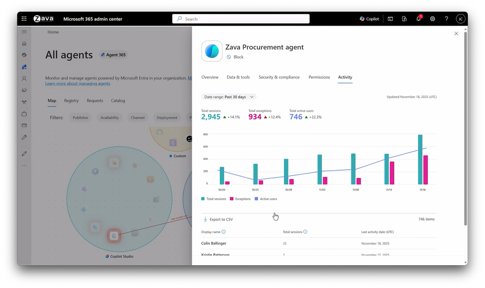 -Next, in permissions, it goes a step further to display which memberships it has across groups and teams, applications it can access, the SharePoint sites it can use. And detailed permissions across graph API calls. Finally, activity displays information about the agent usage, exceptions and active users. And before agents are available for people to use, as an admin, you’re in full control of validating and approving which agents will appear in your organization’s agent store, here’s how.