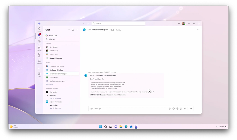 -So, first, let’s start by looking at what Agent 365 can do from a business user’s perspective. In this case, a coworker has created a procurement agent. And our IT team has approved it, and made it available in our company’s agent store. Now, as a procurement manager, I can find the agent and also set it up with just a couple of clicks. Then once it’s up and running, it contacts me in Teams and asks what I’d like it to do and which tasks to perform. As a procurement agent, it recommends that I give it supplier policies, approved supplier lists, and a procurement playbook. So I’ll do that here with my Teams policy guidelines and just type, use this policy guide for your actions. And then / reference my Zava procurement file.