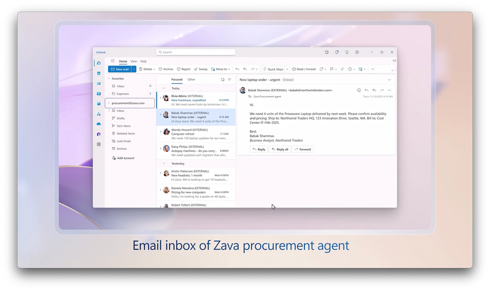 -Now the agent has what it needs to start working. For interoperability with me, other people, and other agents, it has its own suite of Microsoft 365 apps and a unique account to work on its own. In fact, as an order request comes in from a customer for new laptops, the agent reasons over that request using the instructions I provided. And it can also use contextual business information across Microsoft 365 with Work IQ to find these suppliers, their SLAs, pricing from recent orders, and related documents. Based on the fulfillment time, it even recommends a supplier and asks me if it should proceed. Once I confirm, it creates the purchase order for the laptops and logs that into our purchasing tracker Excel spreadsheet in SharePoint. And right from the comments, like I would at mention any coworker, here I’ve at mentioned the procurement agent for status updates. Agent 365 also makes it easier to visualize the agent’s connections, activities, and impact.