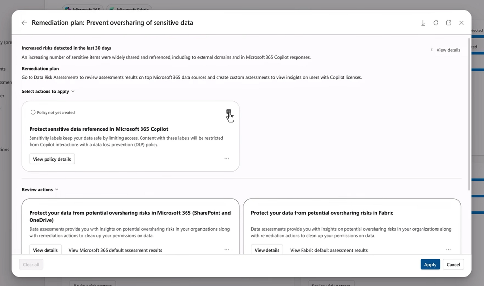- So from creation to risky behavior and even Copilot interactions, the same sensitivity label ensures consistent protection. But the work is never really done. New data keeps coming and risk changes over time. That’s where, because you’ve already classified your data, Purview’s Data Security Posture Management, or DSPM, addresses this by continually assessing your data risk. It’s deeply integrated across Microsoft and beyond, giving you one centralized place to discover unprotected sensitive data across your entire digital estate, including select non-Microsoft services. Built-in intelligence continually assesses data risk to help you prioritize and mitigate high-risk exposures, taking advantage of recommendations where you can strengthen your policy directly from DSPM itself. AI observability features also give you granular insight into what agents are doing and any risk they may introduce. And custom reports make it easy to embed posture management into daily operations by highlighting where to improve.